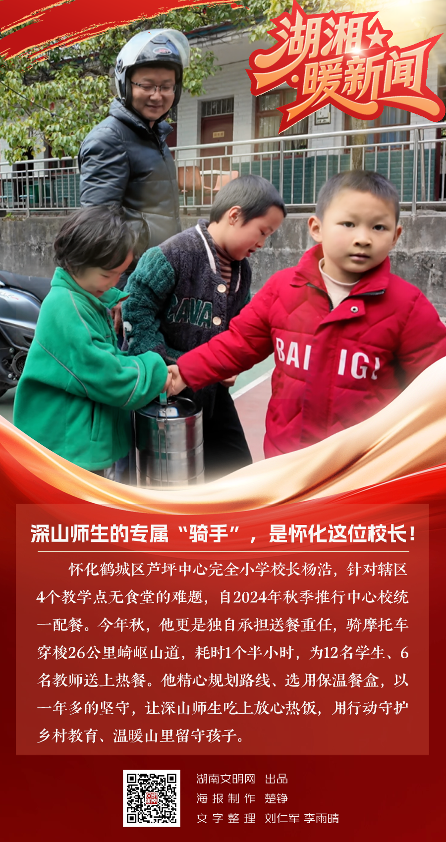 12月19日中午,冬日暖阳漫过鹤城区黄金坳镇的蜿蜒山道。一辆车牌尾号“266”的摩托车正穿行其间,脚踏板上捆扎着不锈钢保温餐盒——骑手竟是芦坪中心完全小学校长杨浩。